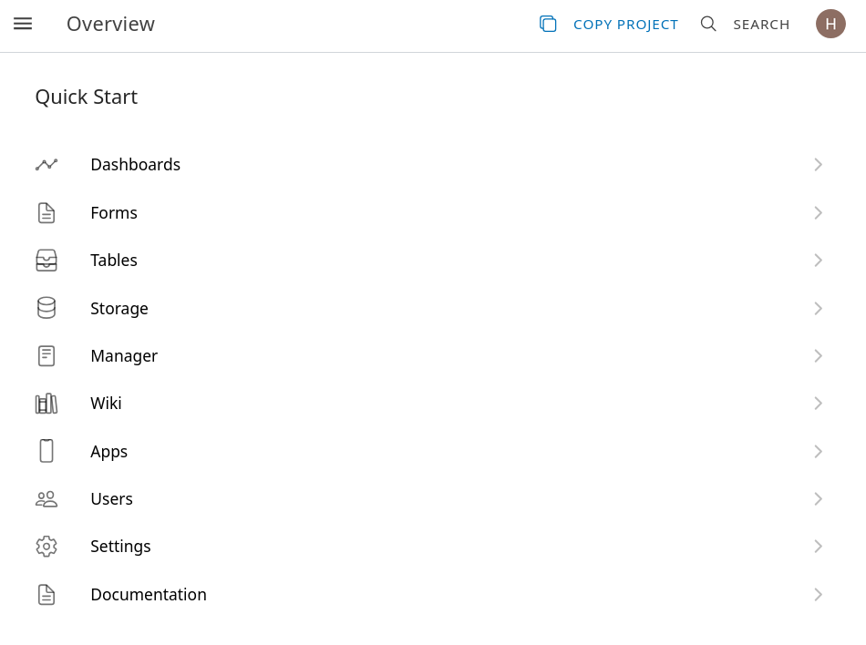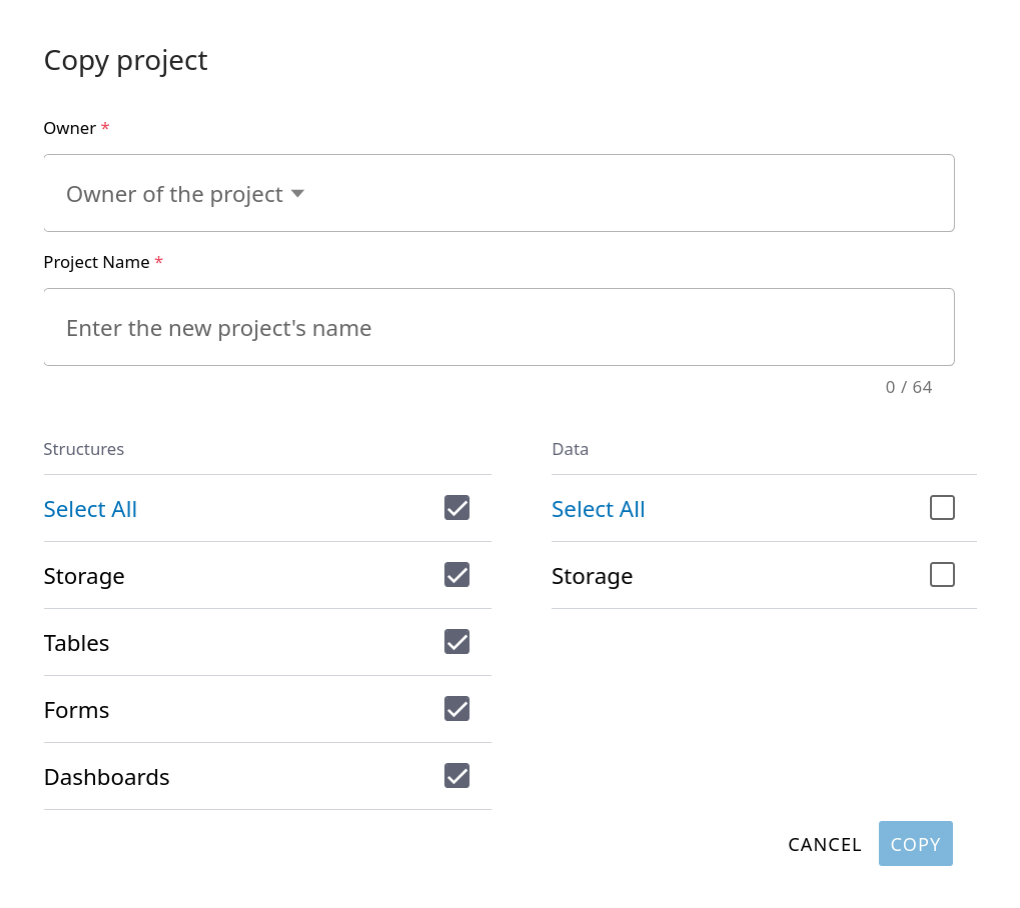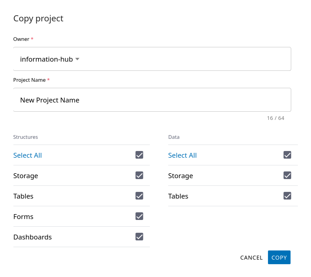 You can copy a project completely, or copy of the structure of a project or template instead of creating new forms, tables and dashboards from scratch.&#x20;