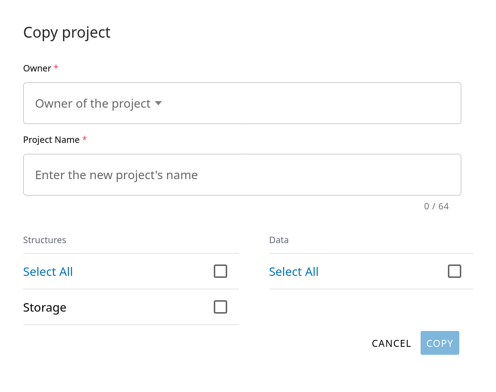 To create a copy of a project an owner must be specified and the project must be given a name.