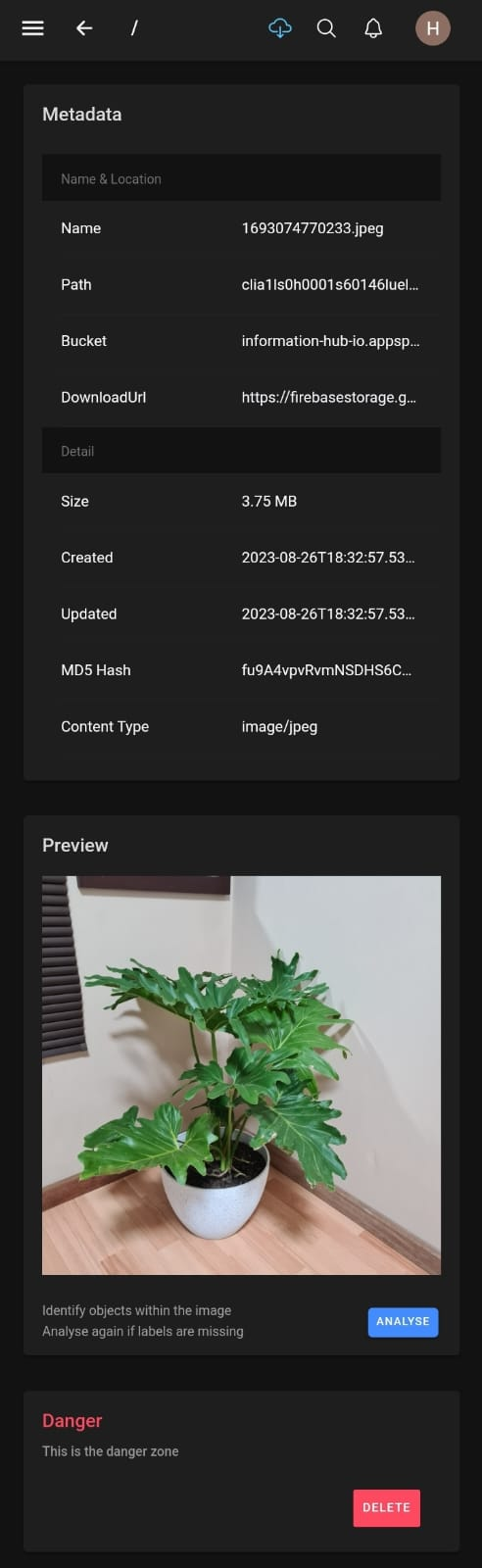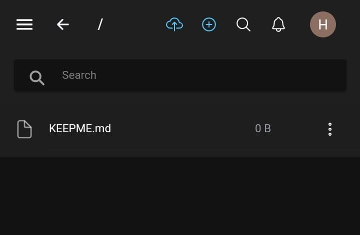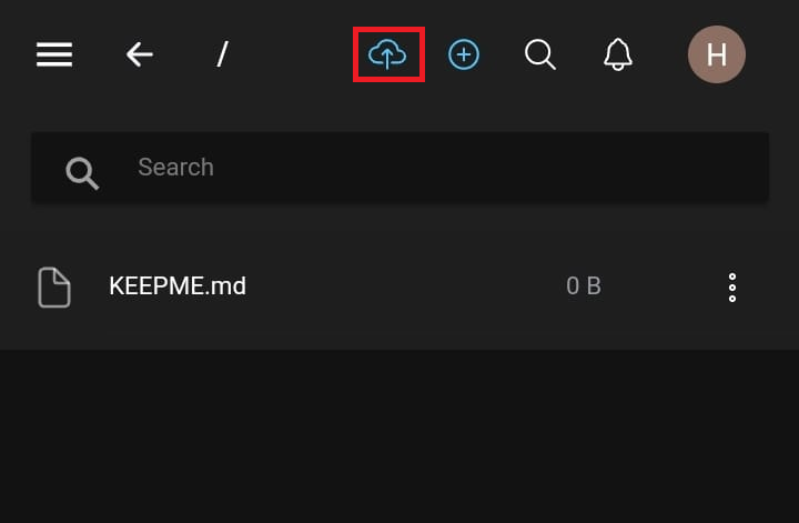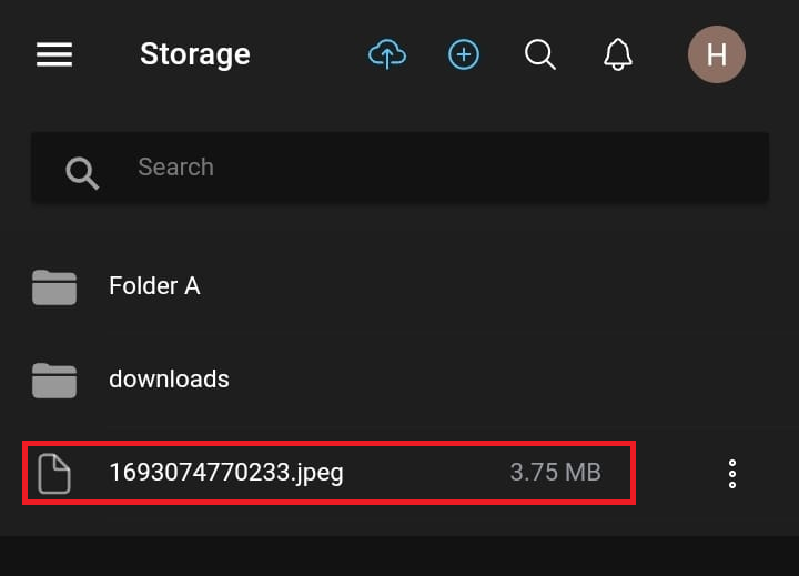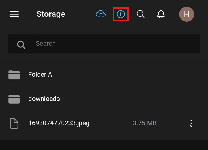 To upload files to storage or a folder inside storage select the cloud button on the top bar to upload a file.