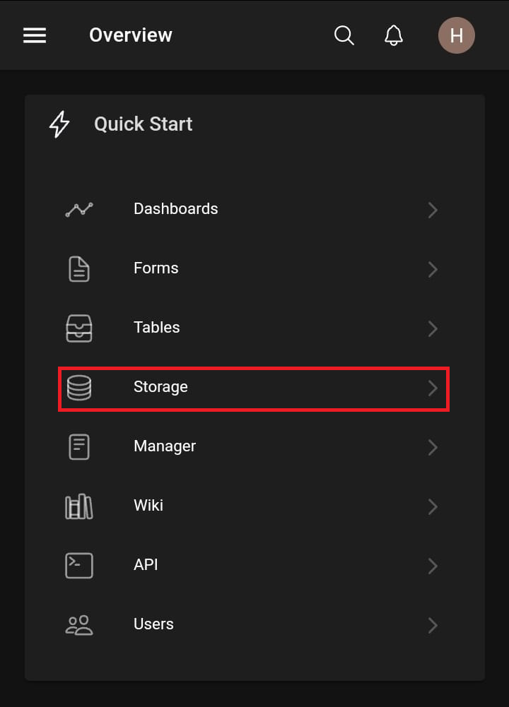 Navigating to the overview page of a project one can access storage by selecting the storage button. Note that storage must be connected to a specific project.