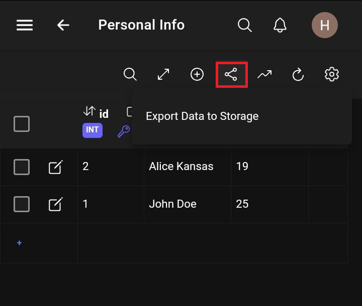 Clicking the export button exports the table and its data to a tab separated value file in a downloads folder one can find under storage.