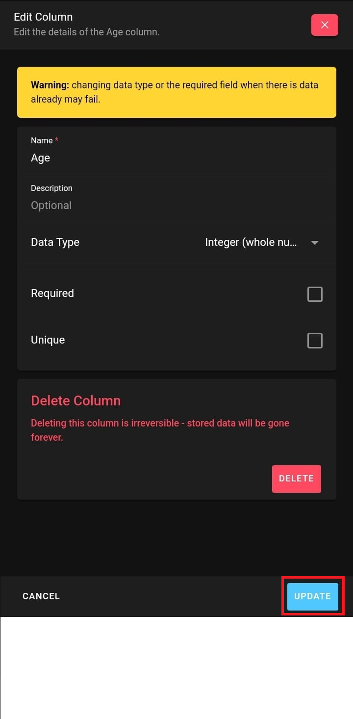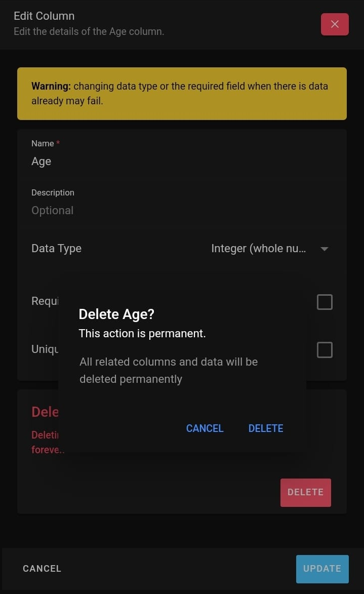 Deleting or removing a column is a straightforward process. After selecting to edit a column one can select the delete button and confirm the choice. Note that all data in the column will be destroyed by the action.