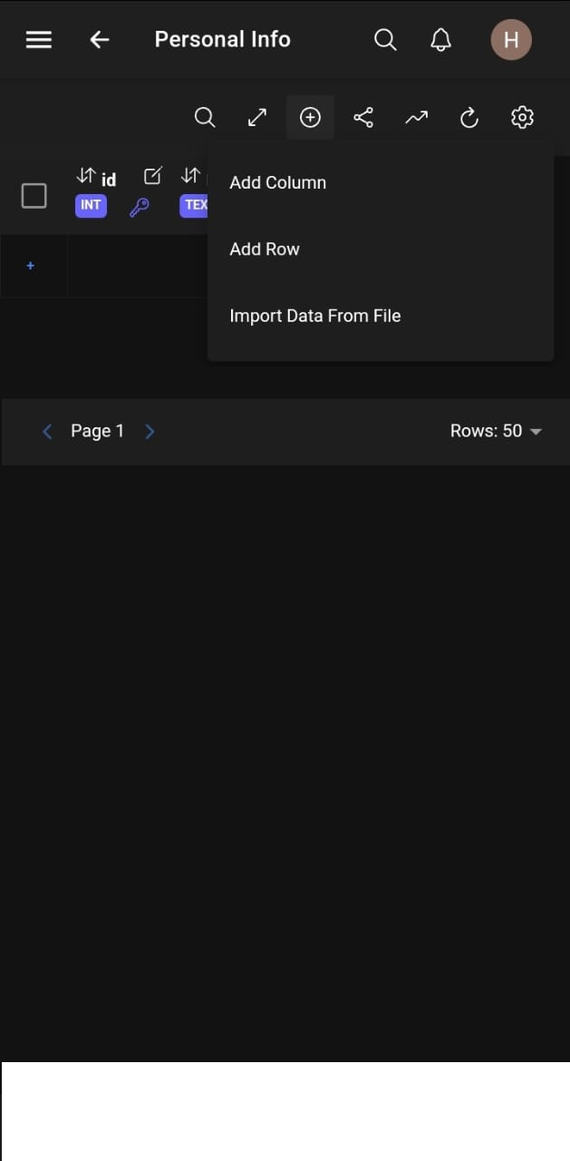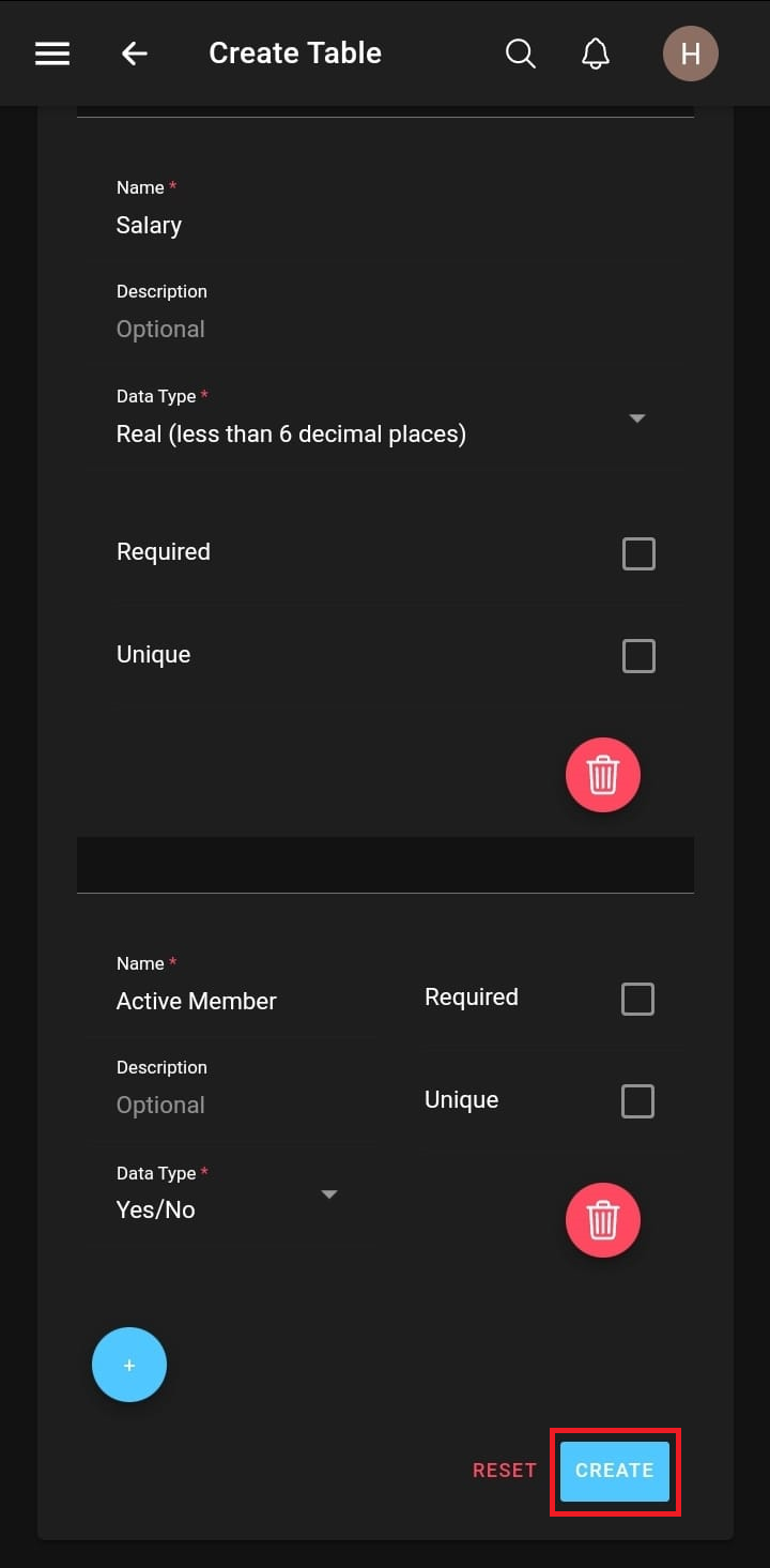 One can add more columns by selecting the round plus button. When columns are added a unique name must be chosen. Each column must specify the data type (integers, real, text) of the values stored within.