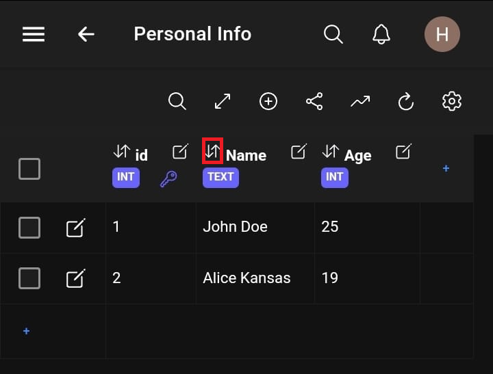 One can sort rows by tapping the ordering button in a column. Tapping it again swaps between ascending and descending order.
