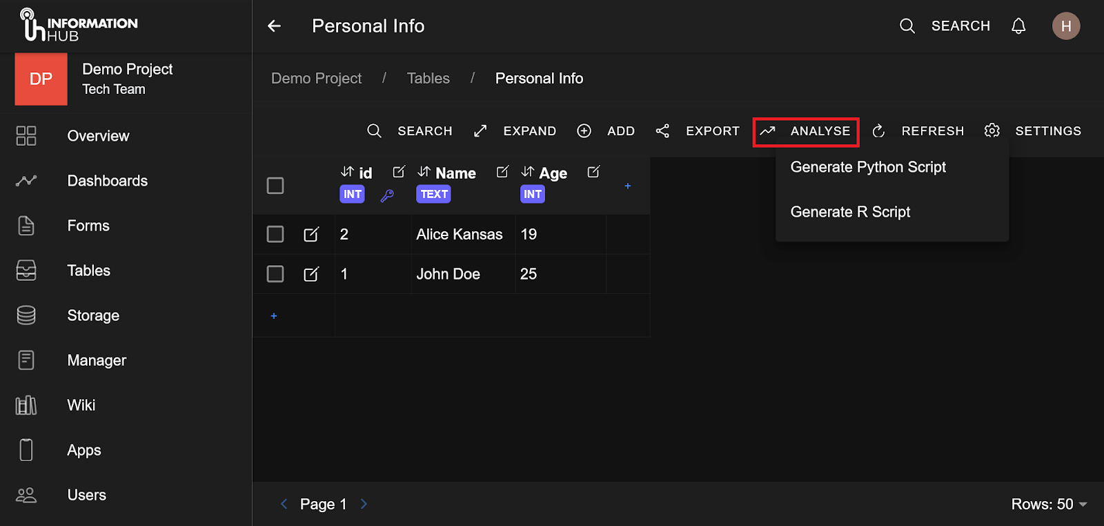 Analysis works best on a desktop environment. One can generate a template Python or R script to pull data from the table stored on the information hub to your machine for analysis and processing.
